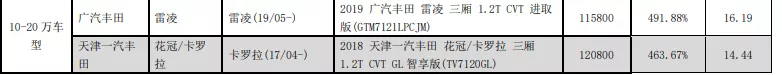 零整比系數(shù)最高的是廣汽豐田的雷凌,有491.88%,比10萬元以下的最高零整比還要高一些,將近一倍;然后就是一汽豐田的卡羅拉,零整比系數(shù)為463.67%,除此之外,其他車型的零整比系數(shù)都沒有超過400%。