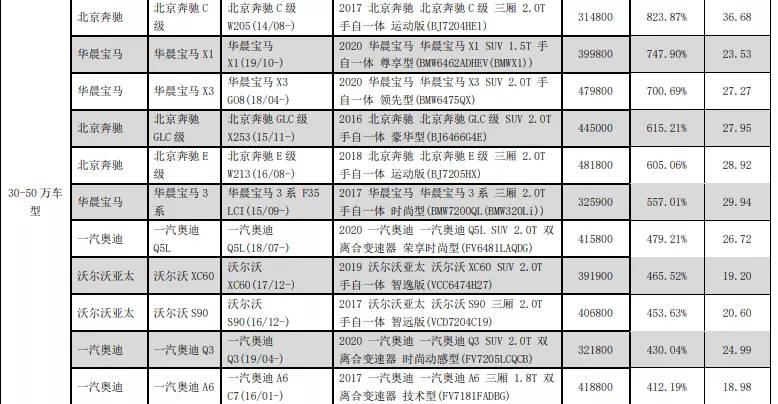 最低的三款車型是奧迪Q3、A6以及A4,零整比分別為430.04%、412.19%和401.79%,這里還得說一下,三款車均來自一汽奧迪。