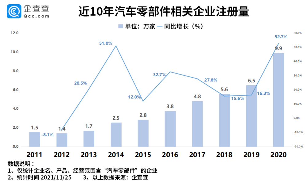 市場(chǎng)前景如何,還有個(gè)數(shù)據(jù)可以作為有力說(shuō)明。2020年,汽車零部件相關(guān)企業(yè)新注冊(cè)了9.9萬(wàn)家,同比增長(zhǎng)52.7%,而2021年前10月共新注冊(cè)12.9萬(wàn)家,同比增長(zhǎng)了76.7%,增長(zhǎng)速度創(chuàng)了近十年的新高。