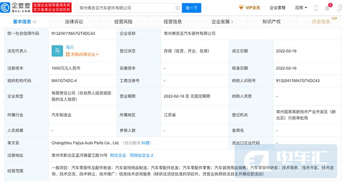 2月23日,常州佛吉亞汽車部件有限公司成立,注冊資本1000萬元。該公司由深圳佛吉亞汽車部件有限公司全資控股,后者由佛吉亞(中國)投資有限公司、比亞迪汽車工業(yè)有限公司共同持股。