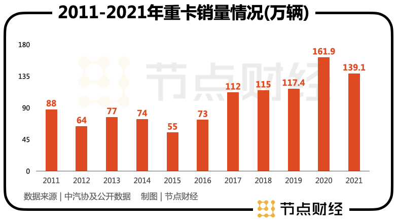 從產(chǎn)品結(jié)構(gòu)來看,一汽解放最主要的營收來自重卡(即重型貨車)。以2021年為例,總計(jì)44萬汽車銷量,其中重卡銷量占79%,達(dá)35萬輛。中型貨車約2.7萬,輕型貨車約6.5萬,另有客車不到1000輛。