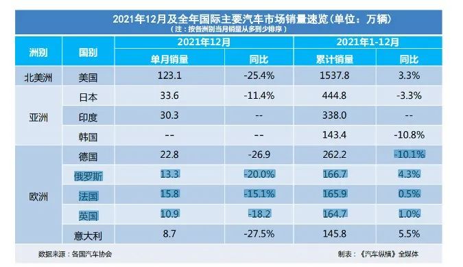 這一情況不僅在國內(nèi),根據(jù)全球主要汽車市場(chǎng)發(fā)布的銷量數(shù)據(jù)顯示,2021 年,由于芯片供應(yīng)短缺嚴(yán)重等因素,疊加疫情影響市場(chǎng)復(fù)蘇,大多數(shù)國家汽車市場(chǎng)銷量連續(xù)下降。
