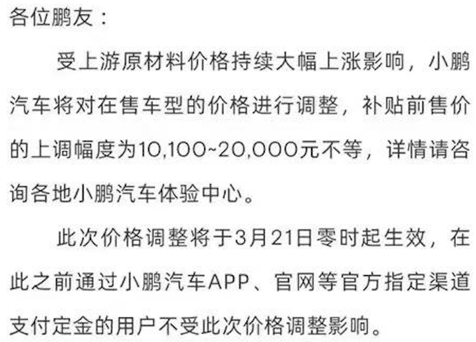 3月21日,小鵬汽車(chē)宣布全面漲價(jià),幅度1-2萬(wàn)元不等,力度不小。小鵬汽車(chē)給的原因是受上游原材料價(jià)格持續(xù)大幅上漲影響。