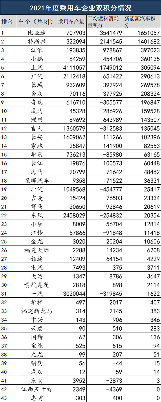4月8日,工信部發(fā)布了2021年度乘用車企業(yè)雙積分情況的公示。