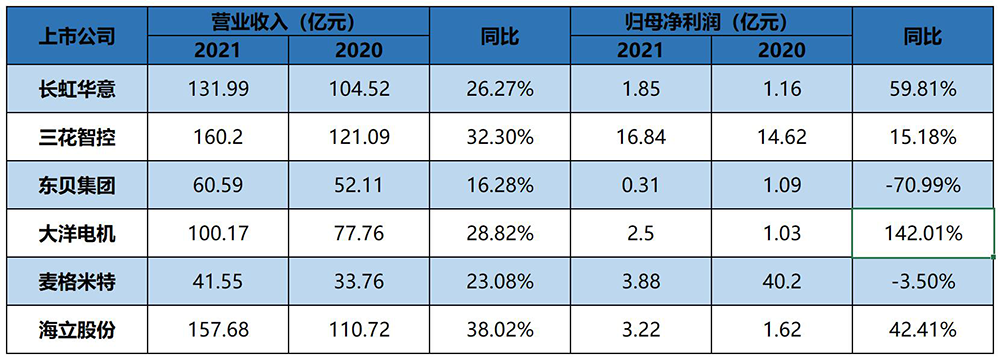 2022年4月29日,海立股份發(fā)布的2021年年報(bào),營(yíng)業(yè)收入157.68億元,同比上升38.02%;歸母凈利潤(rùn)3.22億元,同比上升42.41%。海立股份一改2020因疫情影響導(dǎo)致的經(jīng)營(yíng)頹勢(shì),在2021年不斷優(yōu)化空調(diào)壓縮機(jī)產(chǎn)品結(jié)構(gòu),提升高收益產(chǎn)品的占比,抓住空調(diào)變頻化、非家用空調(diào)領(lǐng)域的市場(chǎng)機(jī)遇,實(shí)現(xiàn)空調(diào)壓縮機(jī)產(chǎn)量2,634萬(wàn)臺(tái),同比增長(zhǎng)1%,銷量2,635萬(wàn)臺(tái),同比增長(zhǎng)0.2%的好成績(jī),保持非自配套領(lǐng)域第一位,行業(yè)排名“第三”。