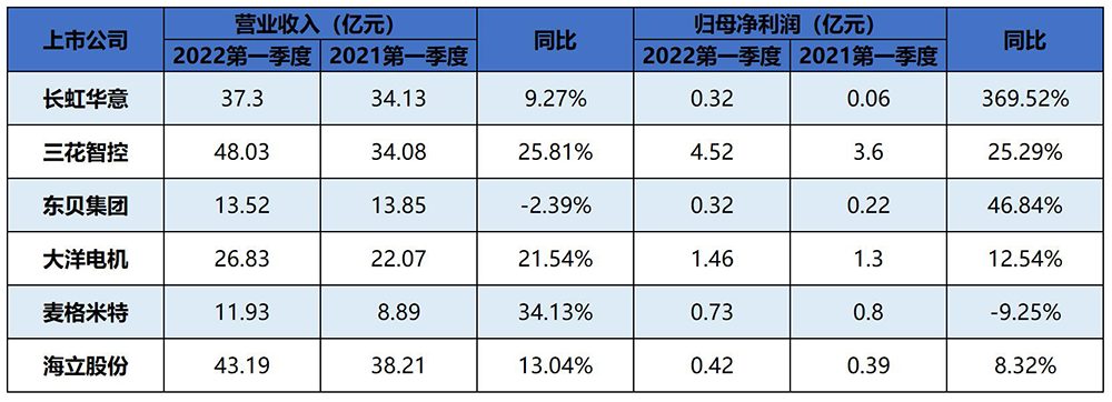 大洋電機(jī)、三花智控和海立股份表現(xiàn)頗佳,繼續(xù)延續(xù)2021的平穩(wěn)增長(zhǎng)勢(shì)頭。麥格米特2022一季度營(yíng)收約11.93億元,同比增加34.13%;凈利潤(rùn)約7347萬(wàn)元,同比減少9.25%。原因在于核心元器件短缺、大宗原材料價(jià)格高位震蕩和近來(lái)的疫情封控對(duì)公司產(chǎn)品交付和綜合盈利能力產(chǎn)生壓制。然而從麥格米特的營(yíng)業(yè)收入增長(zhǎng)數(shù)據(jù)來(lái)看,依然保持了較為旺盛的下游訂單需求,未來(lái)等外界影響褪去后,麥格米特依然能進(jìn)一步提升收入增速和盈利能力。