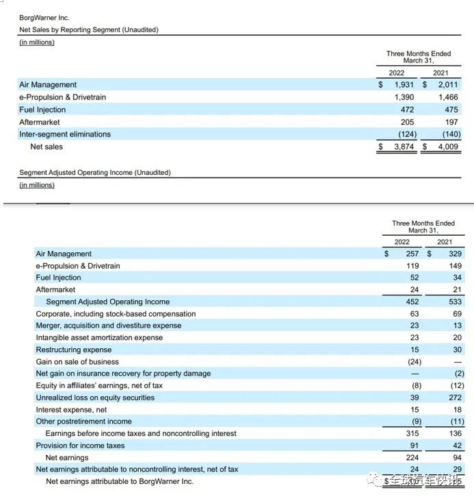 2022年第一季度,博格華納的銷售收入凈額為38.74億美元(約合256.54億元),較去年同期的40.09億美元(265.48億元),公司將業(yè)績下滑歸咎于行業(yè)產(chǎn)量的下滑及外匯走弱。