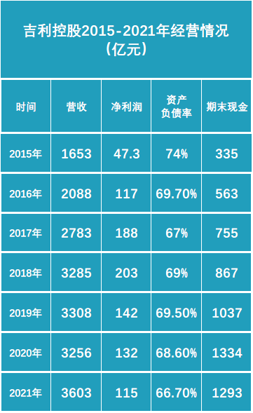 大吉利也隨之進入了銷量和利潤增長的快車道。至2018年吉利控股銷量四年翻番至215萬輛,凈利潤達到了203億元的歷史高位。2019-2021年,雖然在疫情和4.0車型換代的雙重影響下,吉利控股的凈利潤開始下滑,但負債率開始持續(xù)減輕,以加大運營的安全邊際。