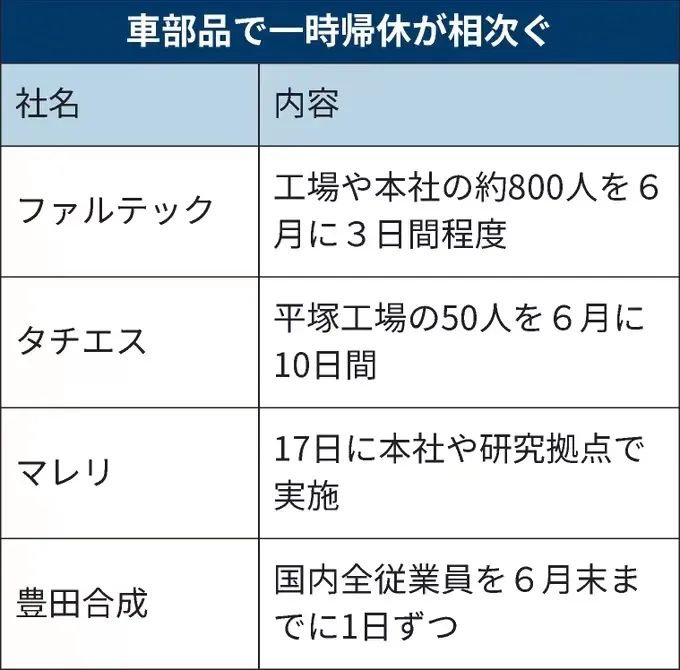 根據(jù)《日本經(jīng)濟(jì)新聞》報(bào)道,生產(chǎn)外飾部件的供應(yīng)商Fal-tec就計(jì)劃在本月休假約三天,涉及800多名員工;座椅生產(chǎn)商Tachi-S也計(jì)劃讓部分員工休假10天,主要涉及東京附近平冢工廠。這兩家公司的主要客戶是日產(chǎn)汽車,由于后者上個(gè)月已啟動(dòng)減產(chǎn),旗下多家供應(yīng)商不得不從6月開始暫時(shí)讓員工休假。