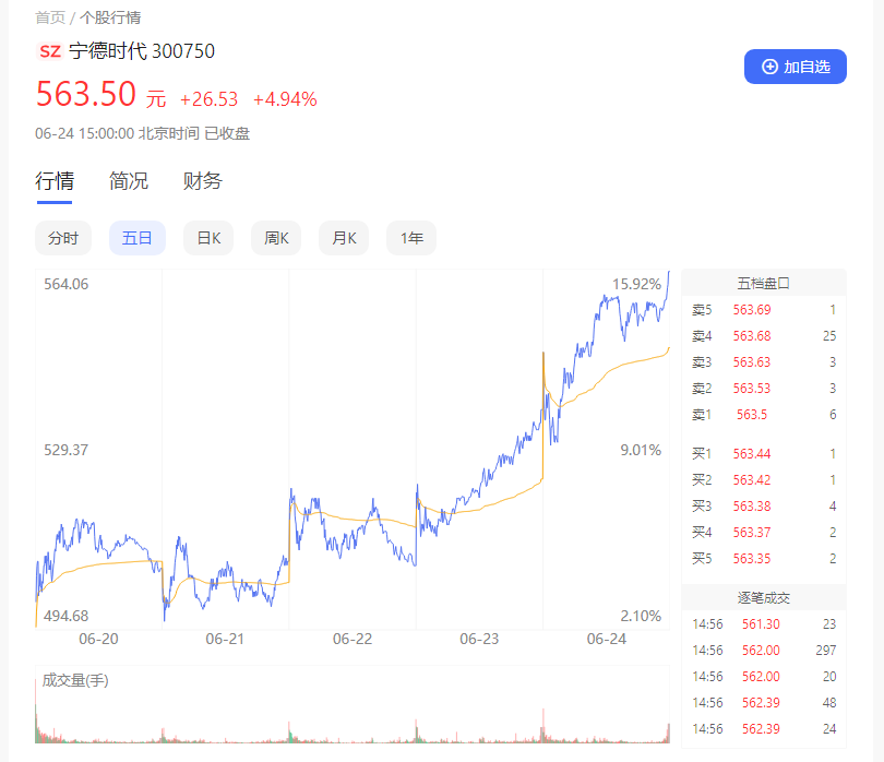上周,寧德時(shí)代的股價(jià)更是一路高歌猛進(jìn)。從周一的495.18元暴漲到了周五收盤的563.5元每股。僅6月24日一天時(shí)間,成交額就高達(dá)百億。