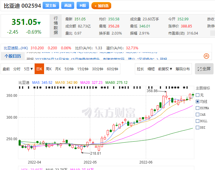 除了長(zhǎng)安汽車外,比亞迪也在近期達(dá)到了歷史新高,從3月209.43元的最低點(diǎn),沖到 6月13日的359.86元,成為第一個(gè)突破萬億市值的國(guó)產(chǎn)汽車品牌,