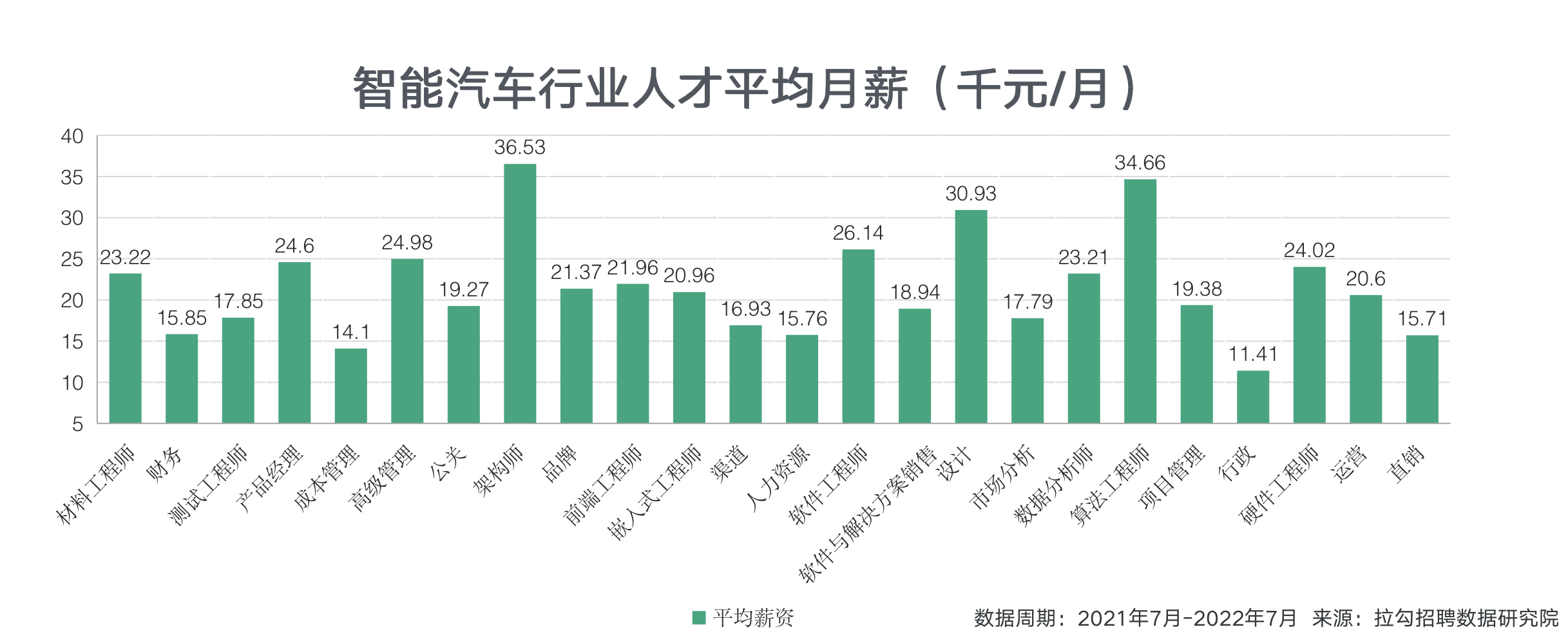 拉勾招聘數據顯示,智能汽車行業(yè)人才的平均月薪達21500元,相比互聯網行業(yè)人才18500元的平均月薪,在普遍高薪的互聯網行業(yè)中依舊具備優(yōu)勢。從細分崗位來看,架構師平均月薪高達36530元,算法工程師月薪高達34660元。分析行業(yè)的人才供需情況,可以看到智能汽車人才總量和結構性短缺并存,外部招聘環(huán)境競爭激烈。