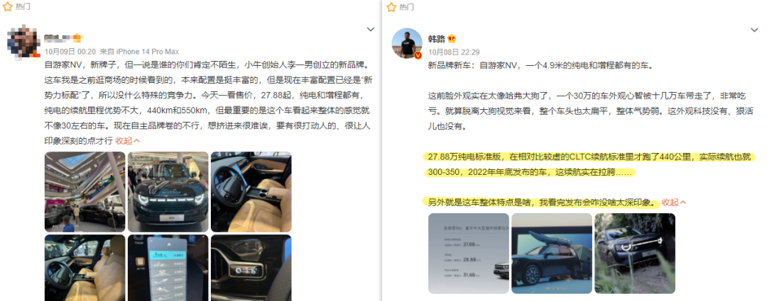 而知名影評(píng)人韓路的評(píng)價(jià)則更為露骨:在相對(duì)比較虛的CLTC續(xù)航標(biāo)準(zhǔn)里才跑了440公里,實(shí)際續(xù)航也就300-350,2022年年底發(fā)布的車,這續(xù)航實(shí)在拉胯……另外就是這車整體特點(diǎn)是啥,我看完發(fā)布會(huì)咋沒啥太深印象。