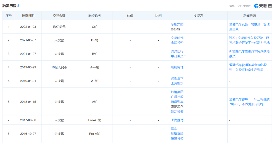 根據天眼查數據顯示,截至今年1月愛馳汽車已進行了7輪融資,融資方包括寧德時代、沙鋼集團、滴滴出行,中合盛資本、陳炫霖及其旗下東柏集團等。據公開披露的資金額度,愛馳汽車融資總額已經超過百億元。