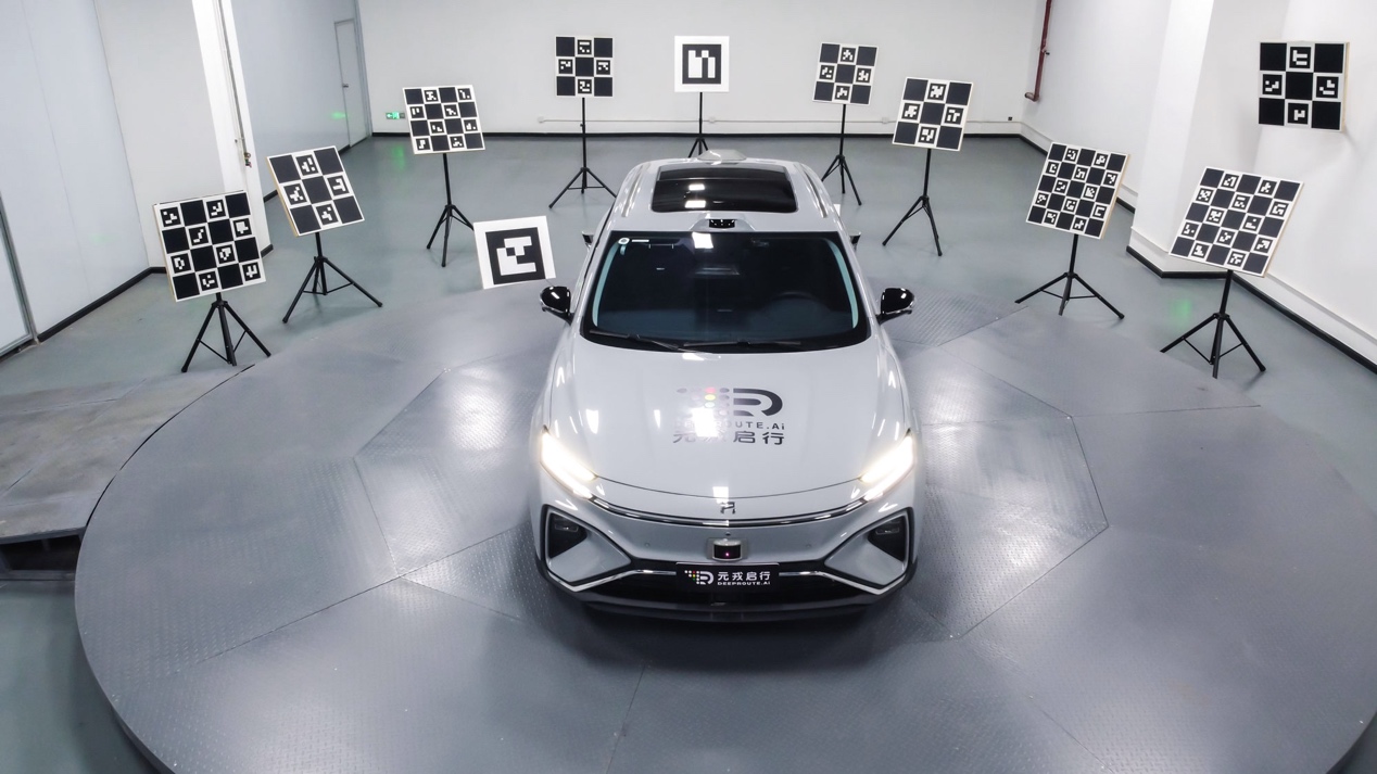 元戎啟行標定車間,采用轉(zhuǎn)臺+ChAruCo標定板設計,可在一分鐘內(nèi)完成一輛車的標定