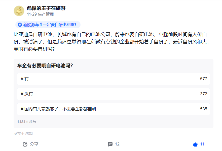 事實上,從長期規(guī)劃來看,“自制+外采”成為眾多車企采用的策略。有業(yè)內人士認為,這可以改變車企在電池領域受制于人的局面,也有利于行業(yè)長期競爭力的發(fā)展。在職場社區(qū)平臺脈脈上,有汽車從業(yè)者發(fā)起投票調查,結果顯示近75%的網友認為車企有自研電池的必要。