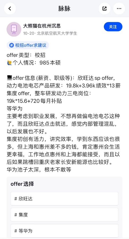 在脈脈上,有網友發(fā)布電池相關“校招offer求建議”的帖子,可以看出,一個沒有任何工作經驗的畢業(yè)生,第二梯隊的電池廠商年包就可以給到20多萬元。