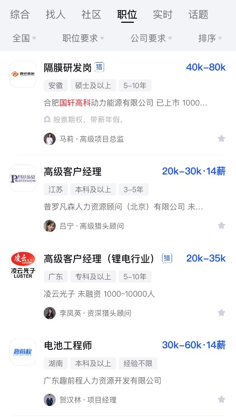 以電池企業(yè)為關鍵詞進行檢索,關于研發(fā)技術崗的年薪普遍在30萬以上。以國軒高科為例,研發(fā)崗位可以達到40K-80K/月,還可能有股權期權激勵,而電池工程師年包可以達到40萬以上。