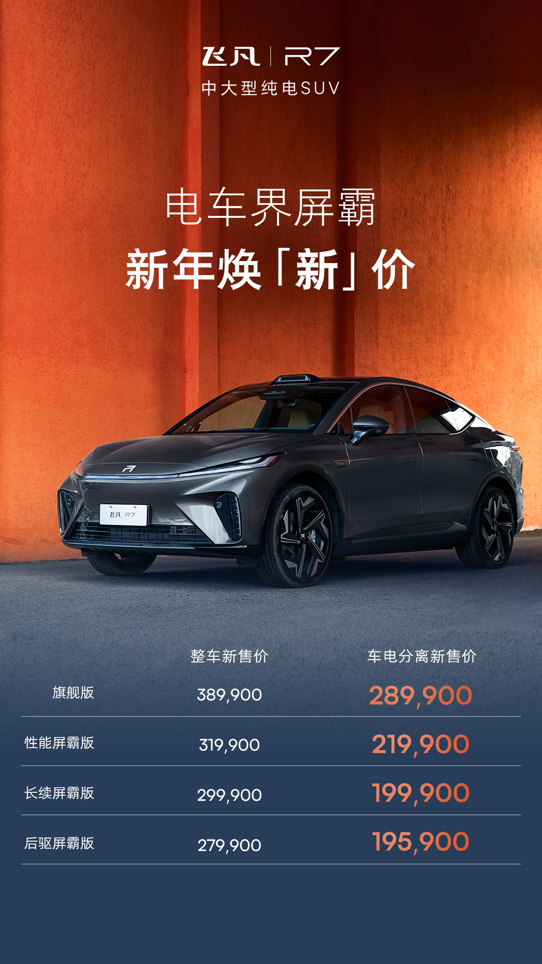 日前,飛凡汽車正式宣布,中大型純電SUV飛凡R7啟動(dòng)“極智·新價(jià)值”產(chǎn)品價(jià)值體系調(diào)整,發(fā)布全新屏霸版產(chǎn)品線,車電分離暢享價(jià)調(diào)整至19.59萬元起,成為目前唯一進(jìn)入20萬元內(nèi)的高端純電中大型SUV。同時(shí),屏霸版產(chǎn)品線賦予用戶最大選擇權(quán),全面開放包含補(bǔ)能場(chǎng)景,智駕場(chǎng)景,配置場(chǎng)景在內(nèi)的多項(xiàng)選擇方案,從買車到用車提供更自由靈活選擇空間,讓用戶以輕松門檻享受極智出行。
