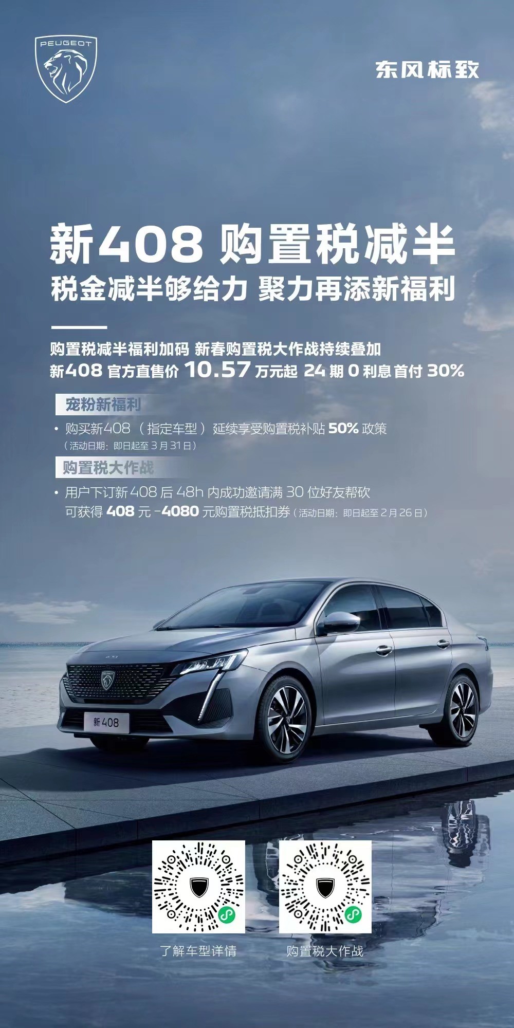 當(dāng)前購買東風(fēng)標(biāo)致新408,還可享受額外福利:即日起至2月26日,用戶通過東風(fēng)標(biāo)致超級APP或東風(fēng)標(biāo)致獅王聯(lián)盟小程序下訂新408后,48h內(nèi)成功邀請滿30位好友幫砍,可獲得408元-4080元購置稅抵扣券;3月31日前,購買新408(指定車型)延續(xù)享受購置稅補(bǔ)貼50%政策。