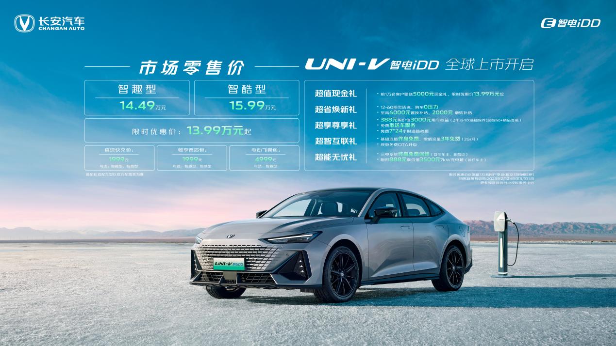 其中UNI-V智電iDD推出兩款車型,售價分別為14.49萬元和15.99萬元,限時優(yōu)惠價13.99萬元;UNI-K智電iDD共推出4款車型,售價區(qū)間為18.79萬-21.59萬元。與售價一同公布的還有長安汽車專門為消費者推出的一系列購車權(quán)益,其中包括超值現(xiàn)金禮(UNI-V智電iDD專享)、超省煥新禮、超享尊享禮、超智互聯(lián)禮、超能無憂禮在內(nèi)的豐厚購車禮遇。