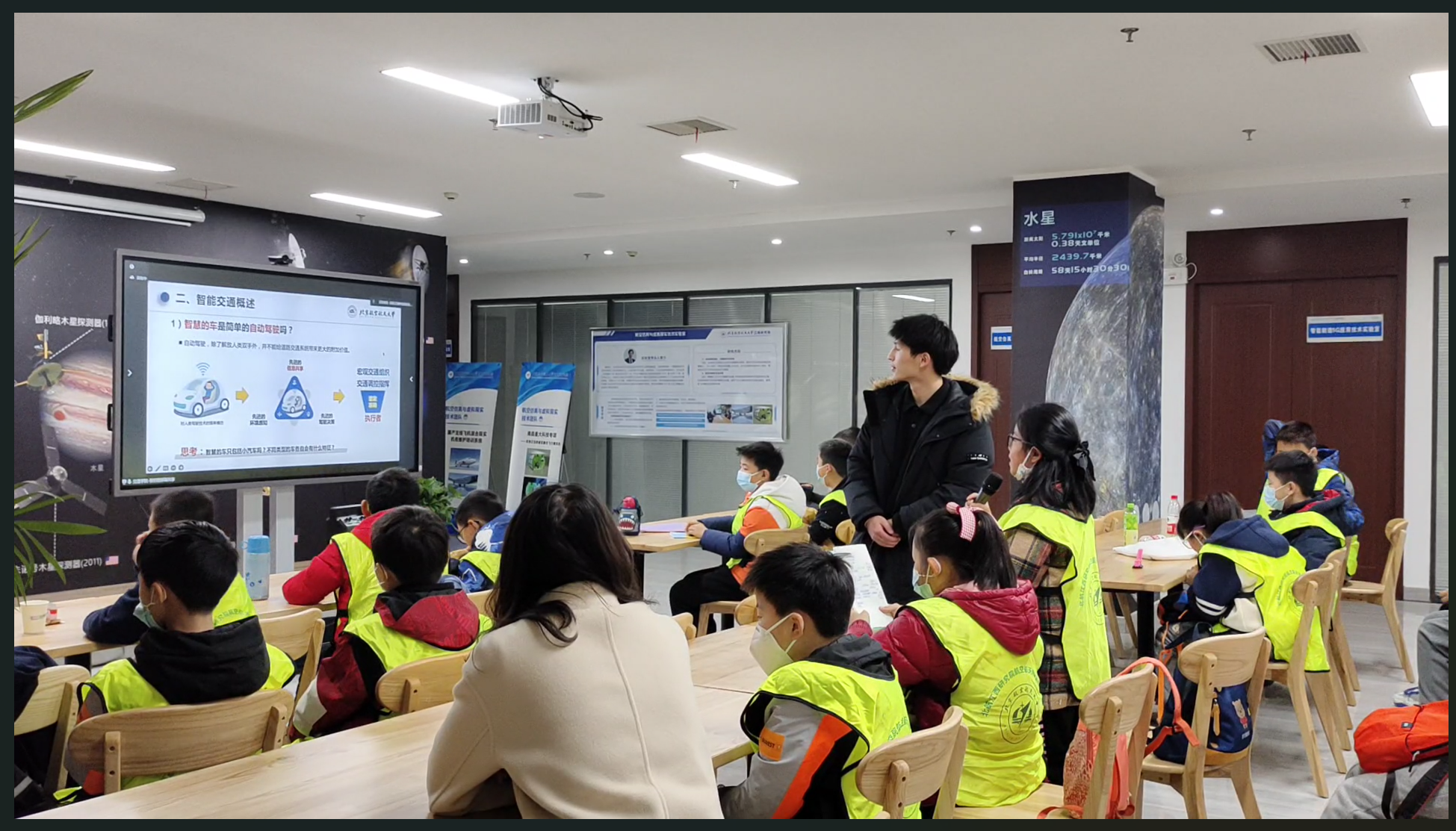 2023年2月2日,由交通學(xué)院“交筑未來”實踐隊聯(lián)合北航江西研究院、江西省科普產(chǎn)業(yè)聯(lián)盟共同舉辦的寒假實踐科普領(lǐng)航營活動在北航江西研究院航空航天科普基地隆重舉行。本次科普活動圍繞“航空航天”“虛擬現(xiàn)實”“智能交通”三個部分展開,來自江西南昌的30余名中小學(xué)生現(xiàn)場參與。在本次活動中,實踐隊特別邀請到北京航空航天大學(xué)交通學(xué)院副教授、博士生導(dǎo)師張釗為營員做科普講座,張釗教授結(jié)合北航相關(guān)研究成果,深入淺出地講解了智能交通領(lǐng)域的研究現(xiàn)狀和發(fā)展前景,受到了營員們的一致好評。同時,實踐隊成員也結(jié)合所學(xué)專業(yè)知識和汽車企業(yè)調(diào)研成果,采用科普講座和體驗互動的方式帶領(lǐng)營員們進一步了解VR技術(shù)和智能交通,在與孩子們的親切互動中傳播科學(xué)知識。