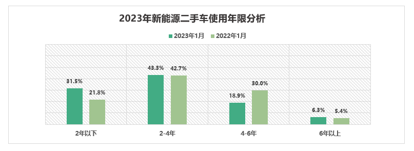 從車齡結(jié)構(gòu)來(lái)看1月份與去年同期相比車齡在2年以內(nèi)的車型占比增漲明顯。延續(xù)了12月份的車齡特征。車齡在4-6年占比出現(xiàn)較明顯下降。具體來(lái)看使用年限在2年以下的占31.5%,較去年同期增加了9.7%。