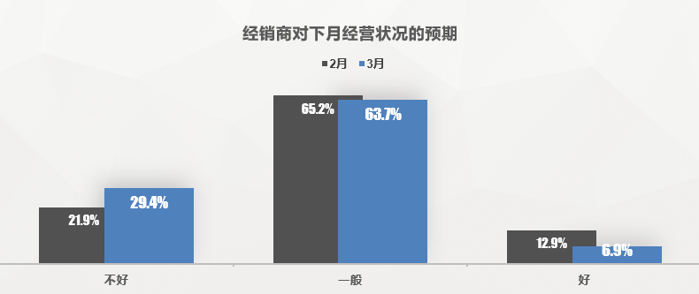 調(diào)查結(jié)果顯示,經(jīng)銷商認為3月市場需求增加。認為下月市場需求“減少”的經(jīng)銷商比例為26.0%;認為需求“持平”的比例為44.6%;認為“增加”的比例為29.4%。認為3月經(jīng)營狀況不好的經(jīng)銷商比例環(huán)比上升,超過6成的經(jīng)銷商認為經(jīng)營狀況可能一般。這主要考慮到季度末廠家要沖擊任務量,所以經(jīng)銷商會加大終端優(yōu)惠力度以期完成銷量任務。