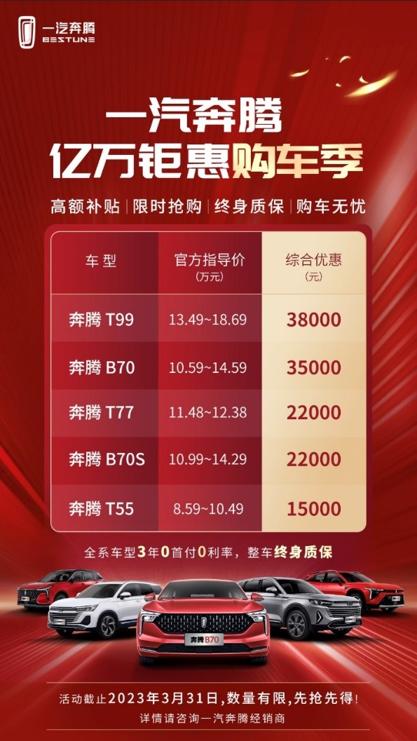 一汽奔騰在售車型覆蓋了8萬-18萬元價(jià)格區(qū)間,擁有B系列車型B70、B70S,T系列車型T55、T77、T99,可滿足不同用戶需求。一汽奔騰億萬鉅惠購車季,奔騰各車型市場售價(jià)全面觸底。