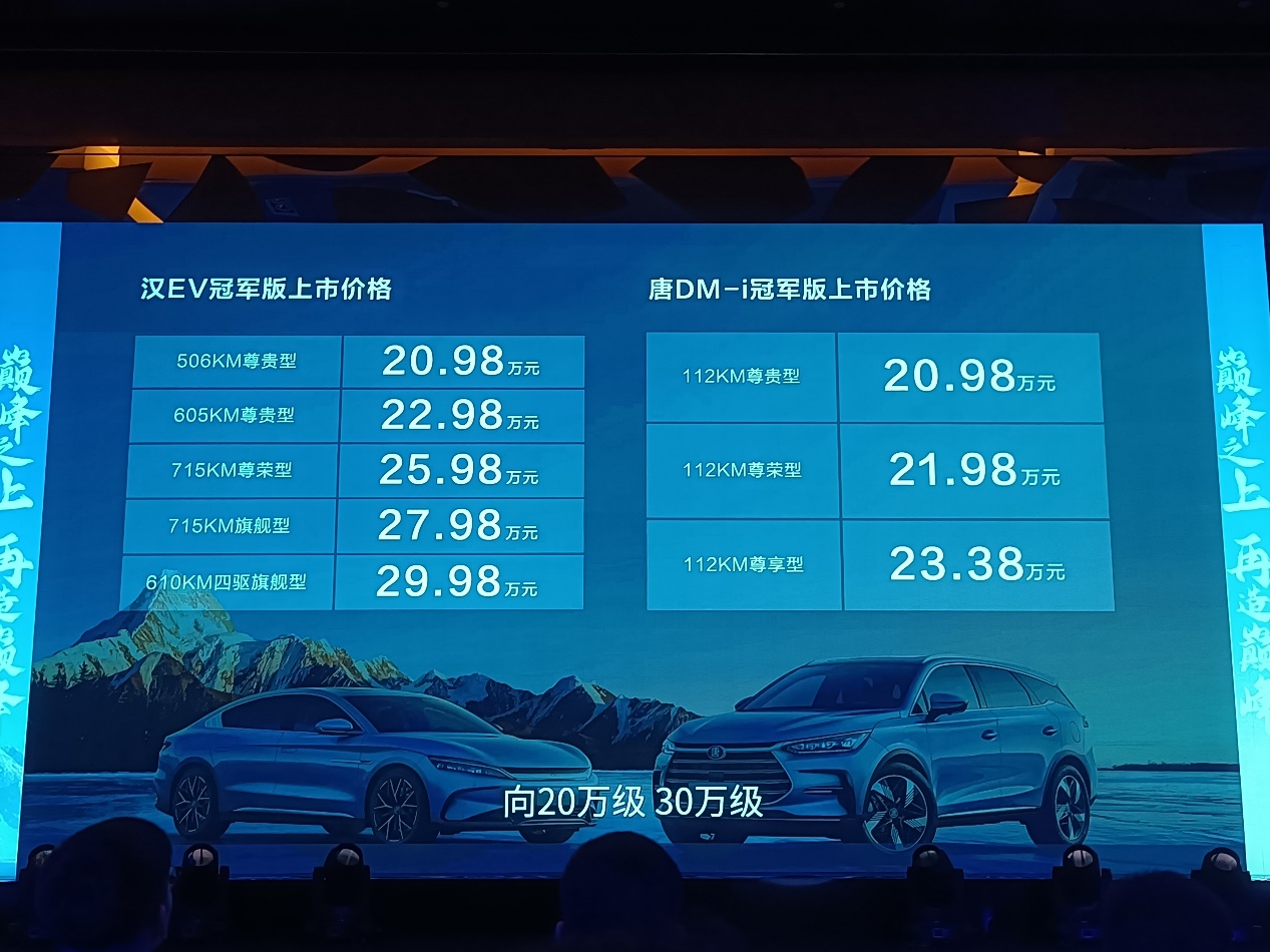 其中,漢EV冠軍版建議零售價(jià)為20.98~29.98萬(wàn)元,唐DM-i冠軍版建議零售價(jià)為20.98~23.38萬(wàn)元,同時(shí)兩款車(chē)型為用戶(hù)準(zhǔn)備了2大無(wú)憂(yōu)購(gòu)車(chē)政策、1大無(wú)憂(yōu)用車(chē)保障、5大專(zhuān)屬貴賓服務(wù)、5大智聯(lián)在線(xiàn)服務(wù)等多重購(gòu)車(chē)禮遇。