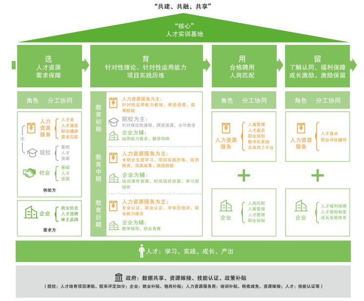 《報告》將人才生態(tài)供應(yīng)鏈總結(jié)為“一核四環(huán)六角色”,即以人才實訓(xùn)基地為核心,圍繞選、育、用、留四閉環(huán)人力資源環(huán)節(jié),由院校、企業(yè)、人力資源技能培訓(xùn)機構(gòu)、社會資源、人才、政府六個關(guān)鍵角色,實現(xiàn)人才供應(yīng)的精準化、生態(tài)化。