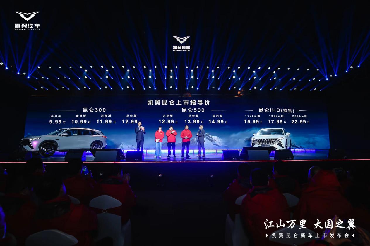 凱翼昆侖的上市價(jià)格由凱翼汽車銷售公司總經(jīng)理何勇平和凱翼汽車車主代表陸續(xù)公布。昆侖300高原版官方指導(dǎo)價(jià)為9.99萬元,山峰版為10.99萬元,天際版為11.99萬元,星空版為12.99萬元。昆侖300行政版15.99萬元。昆侖500天際版官方指導(dǎo)價(jià)為12.99萬元,星空版為13.99萬元,銀河版為14.99萬元。昆侖i-HD混動(dòng)系列的預(yù)售價(jià)分別是:110公里續(xù)航版15.99萬元;180公里續(xù)航版17.99萬元;260公里續(xù)航版23.99萬元。