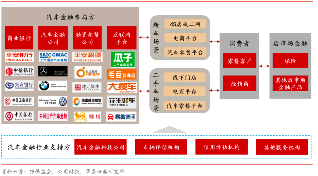 汽車金融產(chǎn)業(yè)鏈參與方及業(yè)務(wù)模式包括商業(yè)銀行、汽車金融公司、融資租賃公司和互聯(lián)網(wǎng)平臺。