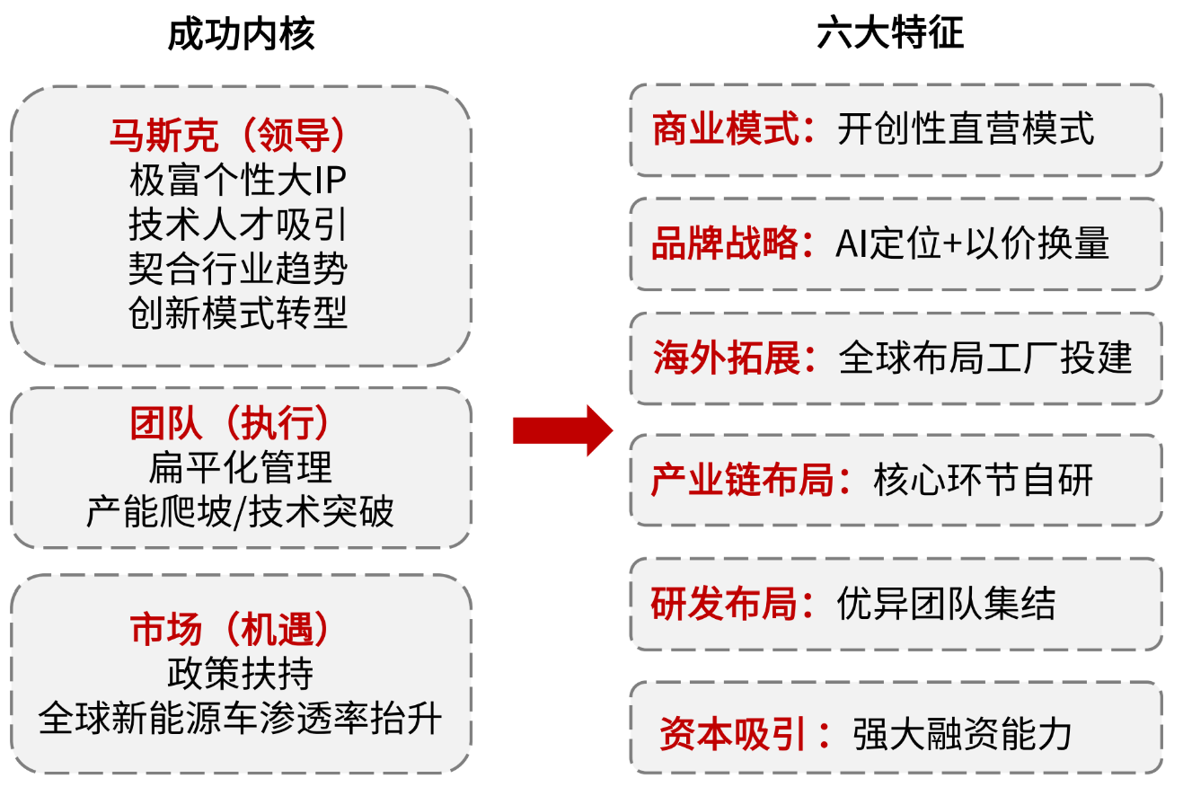 復(fù)盤特斯拉的發(fā)展之路,它的成功主要在于,首先馬斯克基于產(chǎn)業(yè)鏈的前瞻性判斷、“敢想+敢做+堅持+執(zhí)行”性格、“技術(shù)+商業(yè)”雙背景積累。其次其團隊集合了頂尖技術(shù)人才、扁平化/市場化的團隊管理,較強的團隊執(zhí)行力。最后從市場角度看,全球智能電動化需求陸續(xù)釋放,初創(chuàng)類上市公司司獲得了良好的發(fā)展環(huán)境。