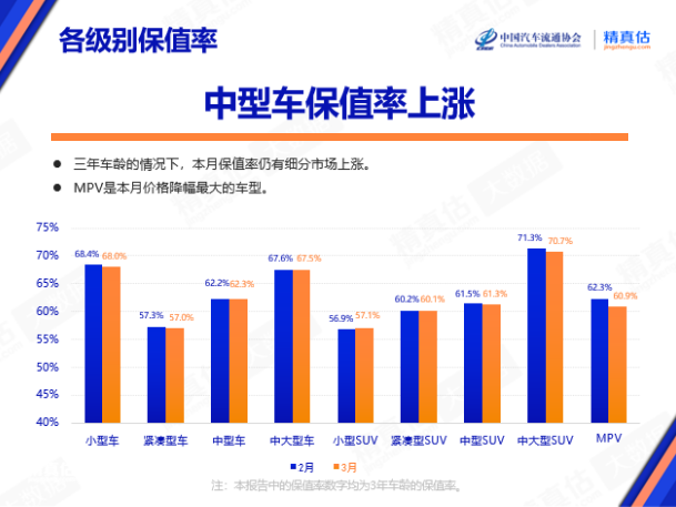 3月各個級別車型保值率中,僅有中型車和小型SUV保值率略有上漲,其他各個級別保值率均出現(xiàn)下降。MPV降幅在各個級別中最大。其他級別車型降價的原因主要是面臨流動性危機,車主賣車困難,二手車價格也受到影響。