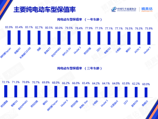 在主要純電動車保值率榜單中,微型車、緊湊型車占比增高,純電車型前3名分別為保時捷Taycan、極氪001、科萊威CLEVER;比亞迪多個車型進入榜單。