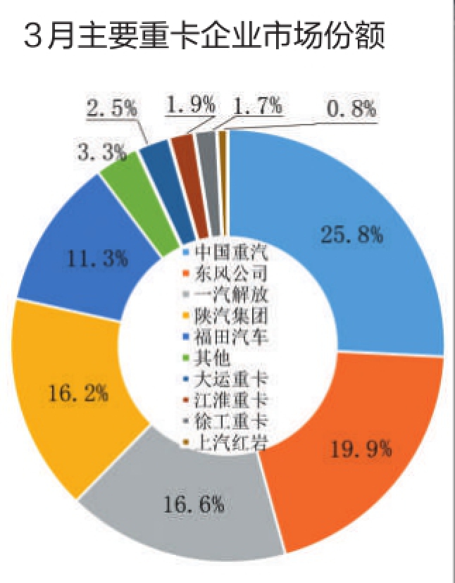 3月重卡市場復(fù)蘇明顯,有8家企業(yè)實現(xiàn)同比增長,其中4家漲幅超40%;東風(fēng)公司、中國重汽、一汽解放、陜汽集團、福田汽車5家企業(yè)月銷破萬輛。