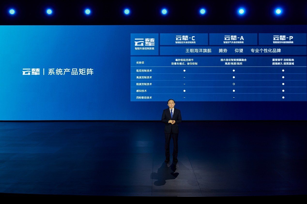 王傳福表示,云輦是首個在垂直方向系統(tǒng)化解決車身控制問題的車身系統(tǒng),實現(xiàn)了上下車身的解耦控制,具有多維感知、精準決策、智能控制、穩(wěn)定執(zhí)行等優(yōu)勢,可全面提升用戶駕乘體驗。該系統(tǒng)由云輦智探架構、云輦智算中心、云輦智控技術、關鍵零部件構成,包含了云輦-C、云輦-A、云輦-P等產(chǎn)品。其中,云輦-C智能阻尼車身控制系統(tǒng),實現(xiàn)車輛舒適性和運動性的完美兼容。云輦-A智能空氣車身控制系統(tǒng),讓整車具備極致的舒適性、支撐性與通過性,樹立奢適新標桿。云輦-P智能液壓車身控制系統(tǒng),能夠實現(xiàn)超高舉升、四輪聯(lián)動、露營調(diào)平等超強越野功能,塑造全球豪華越野新巔峰。