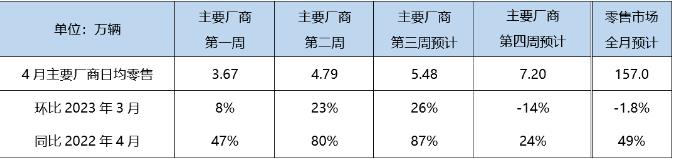 在周度走勢推算方面,主要廠商零售第一、二周的日均分別為3.15萬和3.67萬,環(huán)比分別為8%、23%,第三周預(yù)計(jì)日均零售5.48萬,環(huán)比26%,與第二周走勢基本持平??紤]到3月最后一周存在廠商季度末沖量行為,參考往年季節(jié)性表現(xiàn),預(yù)計(jì)第四周市場環(huán)比-14%,綜合估算4月零售將達(dá)到157.0萬輛。