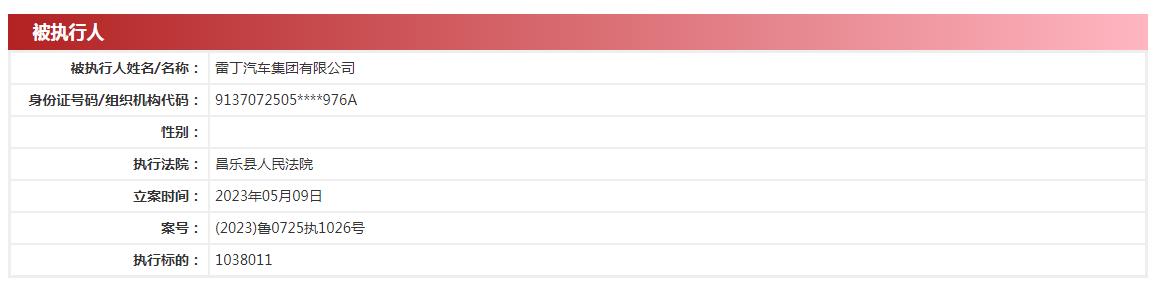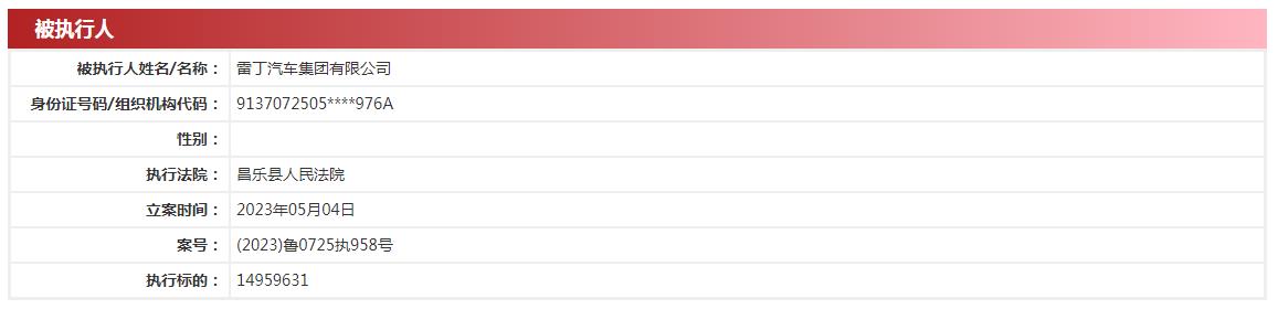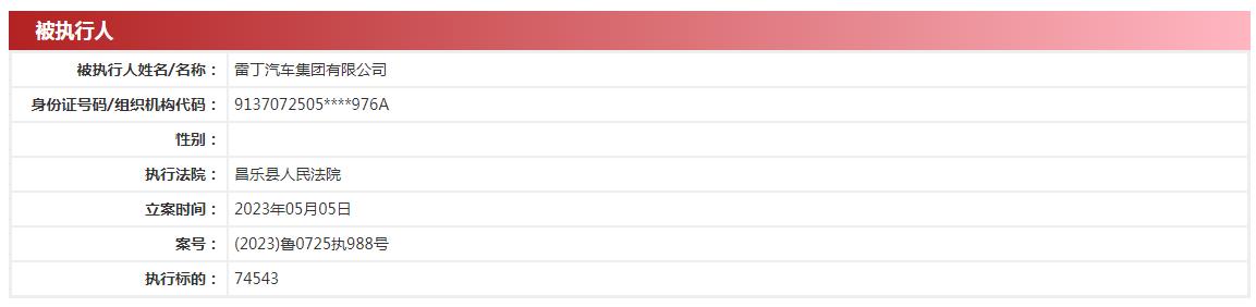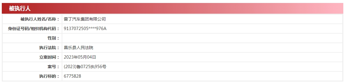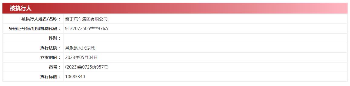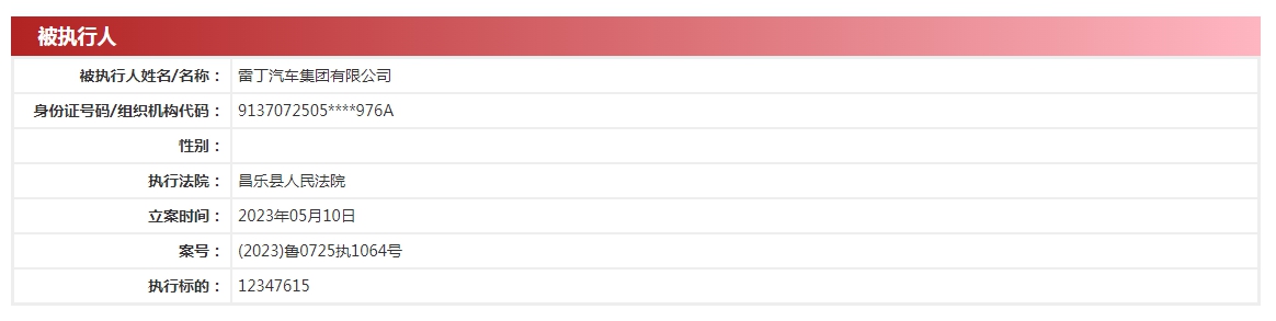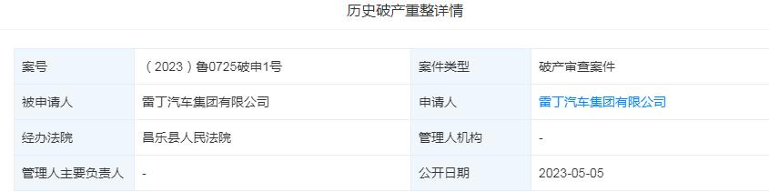 此外,天眼查APP顯示,雷丁汽車(chē)集團(tuán)有限公司5日新增一則破產(chǎn)審查案件,案號(hào)為(2023) 魯0725破申1號(hào),申請(qǐng)人和被申請(qǐng)人均為雷丁汽車(chē)集團(tuán)有限公司,經(jīng)辦法院為山東省濰坊市昌樂(lè)縣人民法院。