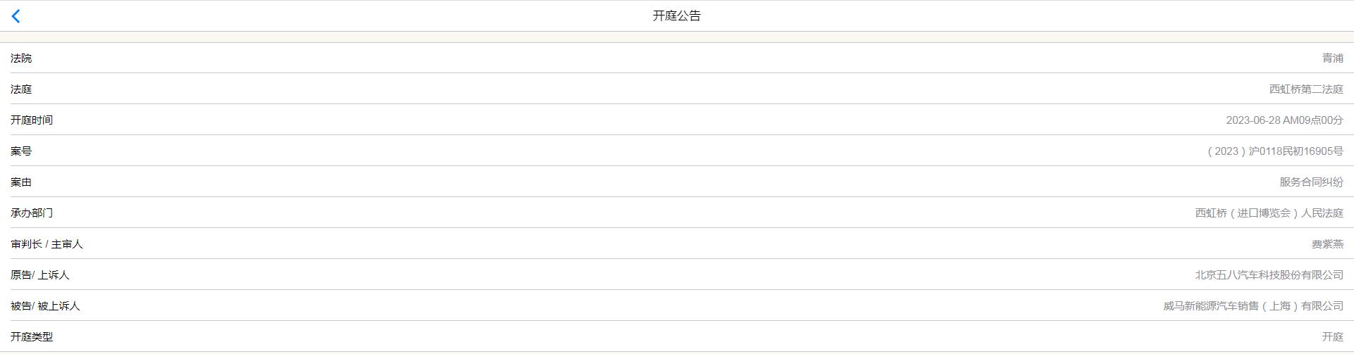 開庭公告顯示,因服務(wù)合同糾紛,北京五八汽車科技股份有限公司起訴威馬新能源汽車銷售(上海)有限公司。