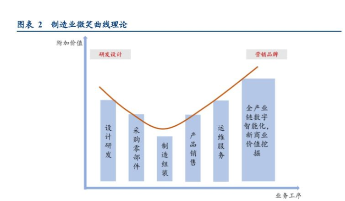 家電企業(yè)為何不約而同選擇自主整合產(chǎn)業(yè)鏈、自建品牌,究其原因主要為謀求利潤(rùn)最大化。家電產(chǎn)品具有貨值高、生命周期長(zhǎng)、產(chǎn)品迭代速度慢、標(biāo)準(zhǔn)化程度高等耐用消費(fèi)品 屬性,其品牌壁壘及行業(yè)話語權(quán)更容易積累,品牌價(jià)值的吸引力更強(qiáng),下游銷售環(huán)節(jié)能 夠直接觸達(dá)消費(fèi)者且附加價(jià)值更高。因此無論是生產(chǎn)轉(zhuǎn)創(chuàng)牌還是錨定自建品牌的模式, 都存在向微笑曲線右端延伸的天然動(dòng)力。