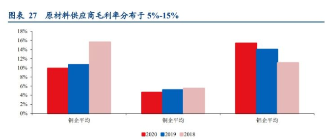 上游原材料供應(yīng)商:利潤(rùn)空間有限。基于充足的市場(chǎng)競(jìng)爭(zhēng)及產(chǎn)品增值屬性弱的背景 下,原材料供應(yīng)商盈利空間有限。此外,國(guó)內(nèi)家電龍頭份額集中且往往大規(guī)模采購, 原材料供應(yīng)商議價(jià)能力不足,進(jìn)一步限制其盈利空間。我們選取鋼、銅、鋁企業(yè)的 平均盈利水平對(duì)比發(fā)現(xiàn),其中鋼企、鋁企的平均毛利率波動(dòng)于 10%-15%,銅企僅在 5%左右,均處于較低水平。