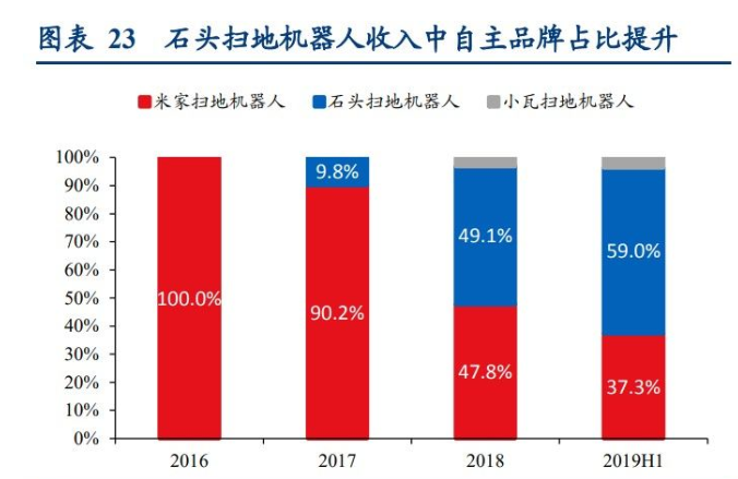 以石頭科技為例,乘小米生態(tài)鏈之風(fēng)迅速崛起,但其盈利質(zhì)量提漲卻依賴于“去小米化”。 石頭科技作為小米生態(tài)鏈的一環(huán),最早借力小米起步,2016 年公司為小米 ODM 掃地機(jī) 器人,依賴于小米渠道迅速打開市場(chǎng),收入利潤(rùn)規(guī)模迅速增長(zhǎng)。所謂有得必有失,小米 生態(tài)鏈企業(yè)的話語權(quán)十分有限,早期石頭科技的利潤(rùn)率處于較低水平。2017 年以來公司 開始推出自主品牌產(chǎn)品,在產(chǎn)品、渠道、品牌等多方面逐步降低對(duì)小米生態(tài)鏈的依賴, “去小米化”漸獲成效,目前自主品牌已具備獨(dú)立勢(shì)能,盈利水平也大幅提升。