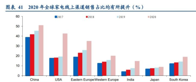 新冠疫情催化海外電商市場(chǎng)繁榮,海外線上渠道跳躍式推廣。據(jù) Euromonitor 統(tǒng)計(jì), 2019 年美國(guó)家電線上份額僅 19.2%,但至 2020 年飆升至 42.5%份額翻倍,其他東歐、 西歐、印度、韓國(guó)、日本等線上份額分別提升