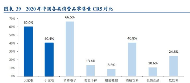 2、家電賽道集中、格局優(yōu)秀,意味著品牌價(jià)值更高,激發(fā)生產(chǎn)商自主創(chuàng)牌動(dòng)力。根據(jù)歐 睿數(shù)據(jù),2020 年中國(guó)大家電、小家電零售量 CR5 份額分別為 60%、40.4%,相對(duì)處于高 位,僅次于消費(fèi)電子(手機(jī)等 3C)產(chǎn)品,而美妝、服裝、食品等行業(yè)格局較為分散。正 如上文分析,由于耐用消費(fèi)品、高客單價(jià)基礎(chǔ)下的慎重消費(fèi),導(dǎo)致品牌口碑價(jià)值在家電 產(chǎn)業(yè)中得以凸顯,家電行業(yè)格局集中,即意味著微笑曲線右側(cè)的“品牌營(yíng)銷”環(huán)節(jié)價(jià)值 更高,家電代工廠商相對(duì)更加具有向品牌運(yùn)營(yíng)轉(zhuǎn)變的動(dòng)力。