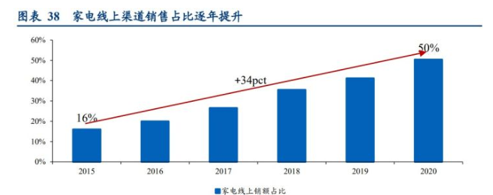 1、渠道呈現(xiàn)扁平化、線上化發(fā)展趨勢(shì),打開廠商直接觸達(dá)消費(fèi)者通路。家電基于耐用消 費(fèi)品屬性,購買決策更依賴于體驗(yàn)感受,因此銷售渠道興起于線下代理分銷制,過去家 電渠道傳導(dǎo)鏈條冗長(zhǎng)。2010 年后以京東、天貓為代表的電商渠道迅速興起,至 2020 年 家電線上銷售占比已達(dá) 50%。同時(shí),線下渠道層級(jí)逐步削減,數(shù)字化變革打通全鏈條信 息流。全渠道信息流拉通后家電廠商更容易直接觸達(dá)消費(fèi)者,同時(shí)也更為依賴消費(fèi)者的 信息反饋進(jìn)行產(chǎn)品優(yōu)化。因此,渠道扁平化、線上化發(fā)展大幅降低了自建品牌以及擴(kuò)大 品牌影響力的難度。