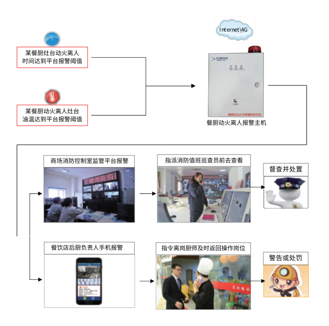 此次合作,項目方在接入了多技術動火離人探測器后,有效化解了大型商業(yè)綜合體目前面臨的消防安全風險。各商業(yè)體消防控制室值班人員利用PC端實時監(jiān)管平臺接收到報警信息后,可實時指派相關人員赴現(xiàn)場督查處理。餐飲店后廚負責人利用手機客戶端接收到報警信息后,可實時指令離崗廚師及時返回動火灶臺操作或照看,并按本店規(guī)定對違規(guī)當事人進行警告或處罰。