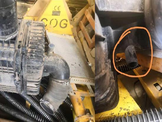 故障檢查:經(jīng)檢查發(fā)現(xiàn)四配套磨損,初步做法更換四配套;在使用200小時(shí)后又噴機(jī)油,還是四配套磨損,檢查各進(jìn)氣管道正常,又一次檢查發(fā)現(xiàn)如下圖,此處應(yīng)是發(fā)動(dòng)機(jī)氣泵進(jìn)氣管接頭處,但由于推土機(jī)結(jié)構(gòu)特殊性,無(wú)空壓機(jī),此處應(yīng)為封閉狀態(tài),懷疑此處故障;