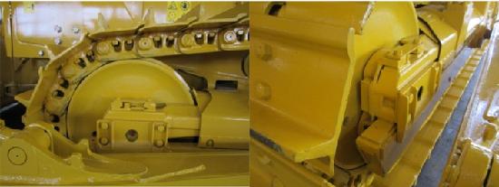 側(cè)板緊壓在臺(tái)車架上,強(qiáng)使引導(dǎo)輪沿臺(tái)車架導(dǎo)向板前后移動(dòng)。因此當(dāng)引導(dǎo)輪移動(dòng)時(shí),側(cè)板會(huì)受到磨損,并引起引導(dǎo)輪左右擺動(dòng)或傾斜,而導(dǎo)致引導(dǎo)輪脫出履帶,或造成鏈軌節(jié)和引導(dǎo)輪磨損不均勻。為避免這些事故的發(fā)生,需調(diào)整側(cè)板和臺(tái)車架之間的間隙。